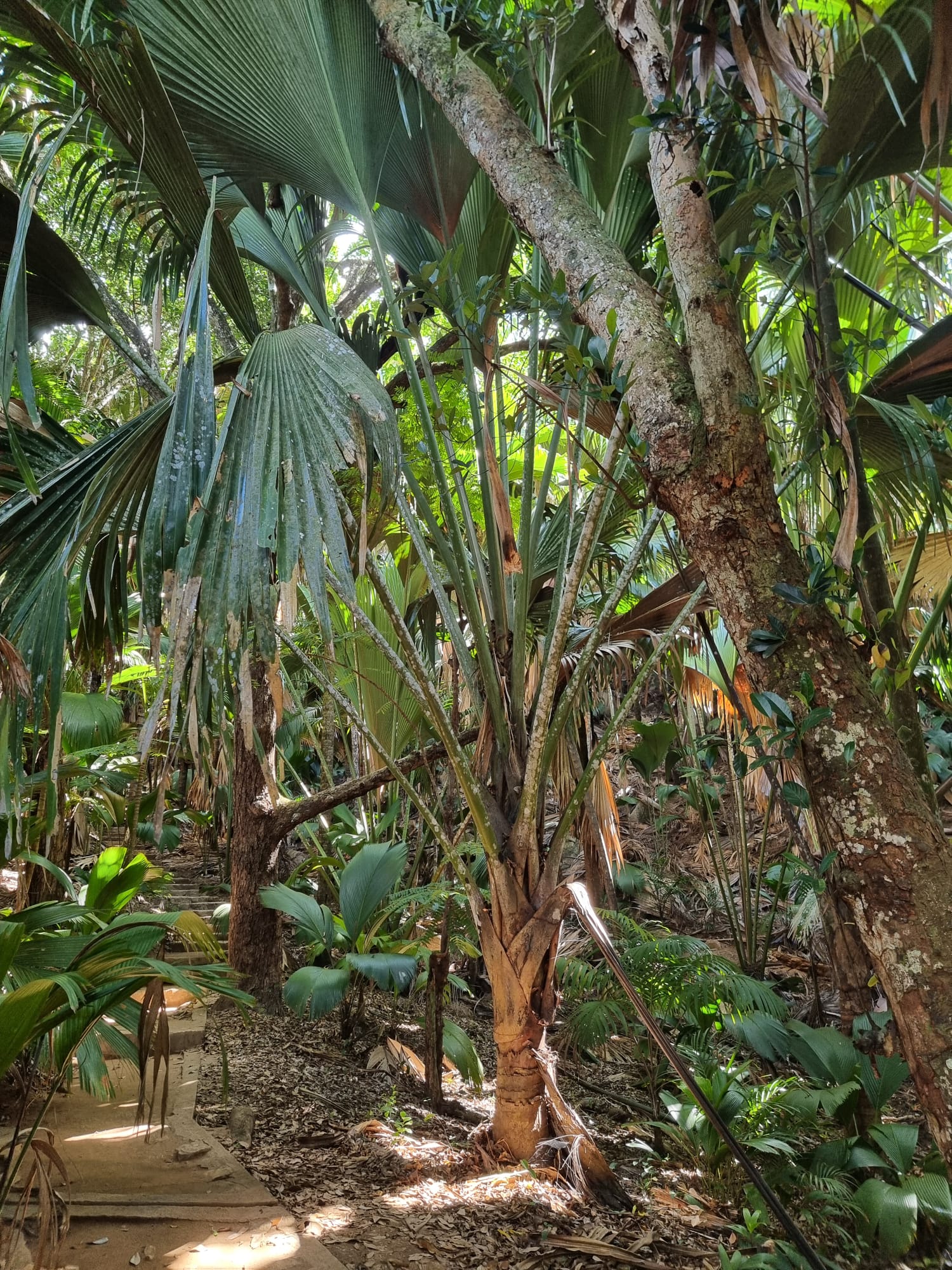 Maar goed, de Coco de Mer (Lodoicea maldivica) is een enorme palm in al zijn delen. Naar het schijnt produceert deze het zwaarste zaad van alle planten op deze aardbol. Je hebt mannelijke exemplaren en vrouwelijke. ik begreep dat een zaad er ruim twintig jaar over doet om te ontwikkelen en af te rijpen.