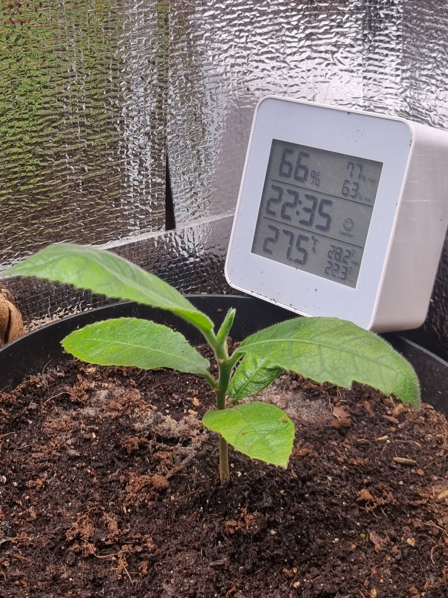 Nadat ik de bodemtemperatuur heb verlaagd, deed de Moringa eigenlijk nog het zelfde: s'avonds hangen en de volgende ochtend weer staande in zijn volle glorie.