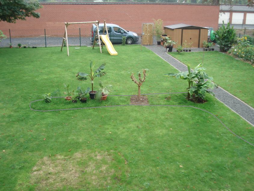 Die waggie helemaal op de achtergrond komt hier volgend jaar ook bij te staan. Daar waar nu de Washingtonia in pot staat.