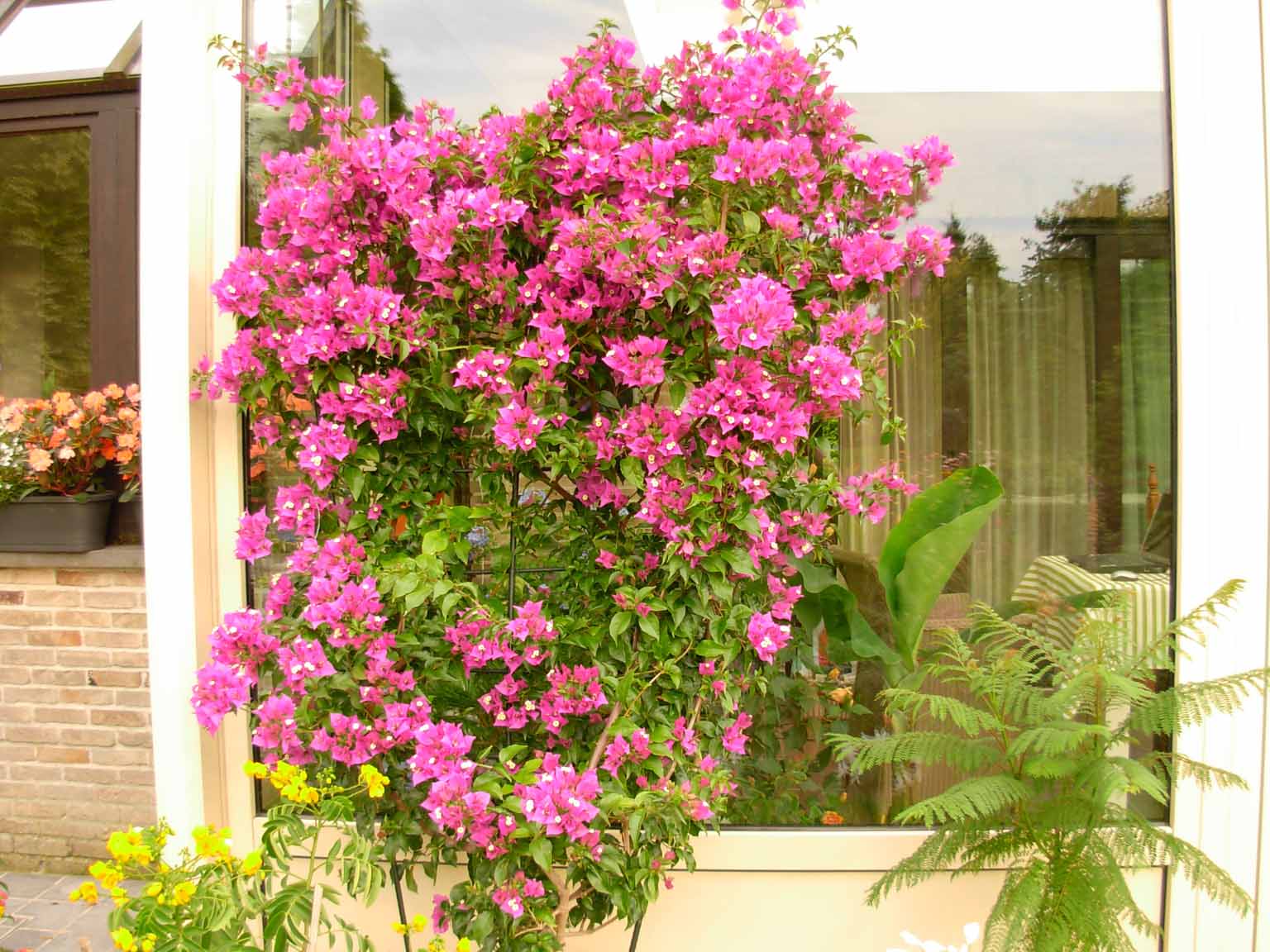 Mijn bougainvillea snoei ik ook ieder jaar redelijk fel - ik probeer ook te wachten tot de meeste bloemen uitgebloeid zijn en in de praktijk snoei ik de niet bloeiende takken sterk terug bij het binnenkomen .Hij bloeit toch op het nieuwe hout dus mag je vrij diep snoeien .Aanvankelijk snoei ik tot waar er nog 2 blaadjes aan de tak staan , en als hij dan op de kale takken terug uitloopt , dan snoei ik hem vaak nog heel wat lager .Zo krijg je een stevige plant die na een tijd een hoofstam krijgt die zichzelf steunt en blijft de struik redelijk open , zodat er lucht en licht in kan en het geen broeihaard is voor insecten .Wel is het belangrijk dat hij niet te warm staat in de winter ,maar graag licht .Mijn eerste bougainvillea stond in de zomer in de warme veranda en in de winter kwam hij in de living met als gevolg enorme bladval en nauwelijks of geen bloem .Nu staat mijn bougainvillea vanaf half mei buiten in de zon tot ongeveer half september en heb ik zo goed als heel de zomer heel veel bloemen en vaak bloeit hij binnen nog een hele tijd door .