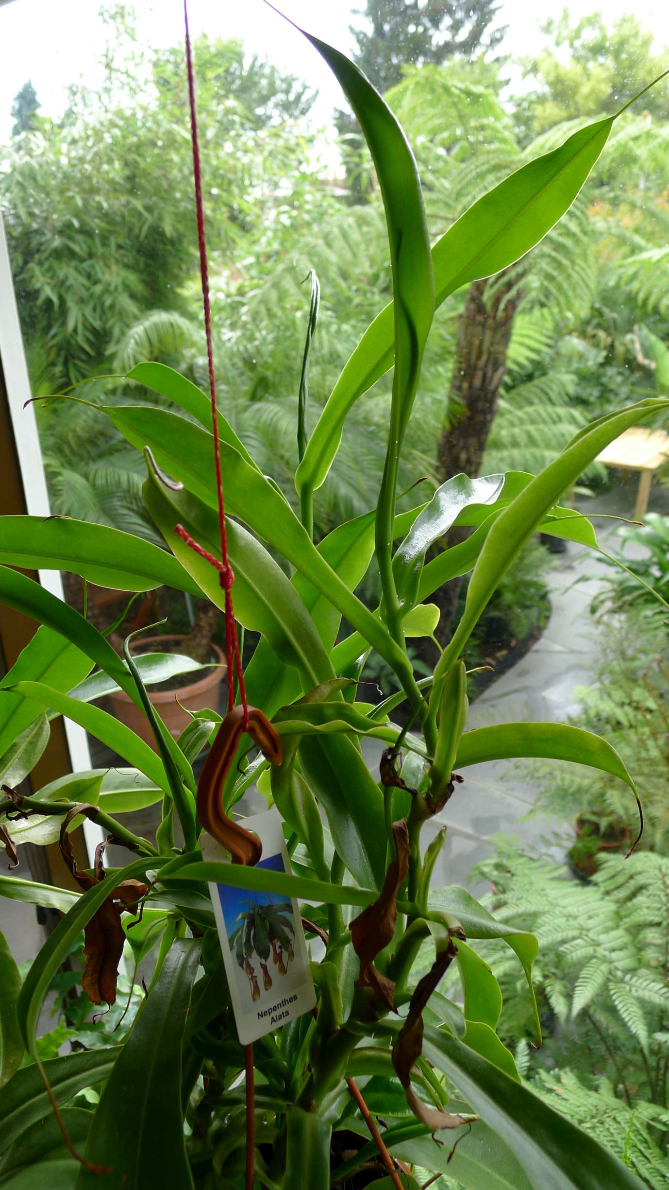 Van beide nephenthes van mij zijn al maanden geleden de kelken verdwenen, maar bij 1, de 'Rebecca' Soper komt nu wel bloei. De andere, gelabeld 'alata', groeit ook aardig, maar geen bloei. Zouden er ooit weer eens kelken komen?