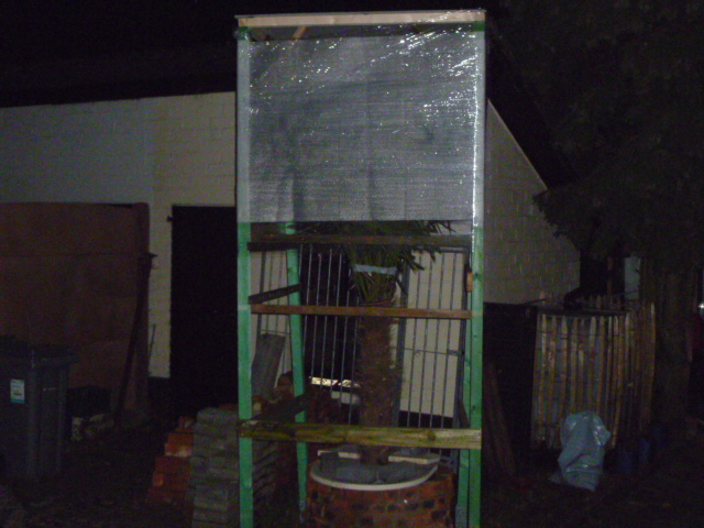 als het gaat vriezen dat het kraakt dan heb ik altijd een oud deken rond de stam gewikkeld,/ deze wordt niet nat door het plastick bovenaan/