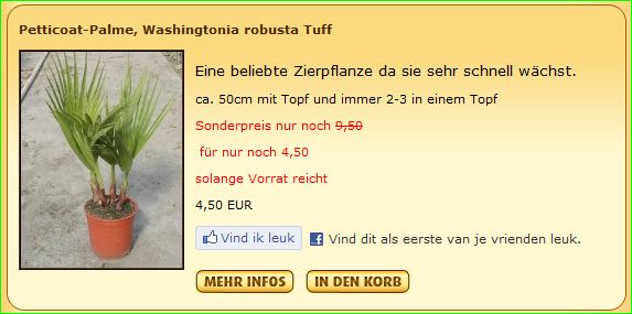 Nou voor de washingtonia robusta wel heeeel erg duur. Zie hier bij onze oosterburen, vandaag even op hun site gekeken. Wel een aanbieding maar net zo groot maar met 2-3 stammetjes