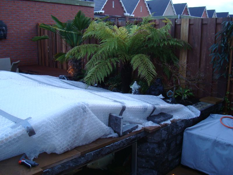 Hoi, waar woon je ergens? dat verteld ook weer wat je in de winter aan vorst kunt verwachten! Eigenlijk moet je latjes of iets dergelijks om de stam zetten zodat er een luchtlaag blijft daar omheen het vliesdoek een paar maal draaien, dan de lichtslangen daaromheen en losjes de noppe folie, zo te zien heb je het er vrij strak omheen zitten, ik zou wachten op droog weer en het dan nog eens [losjes ] overdoen, die lichtslang pas insteken bij -6 en meer! maar niet bij dit kwakkel weer, mooie planten die je hebt staan.