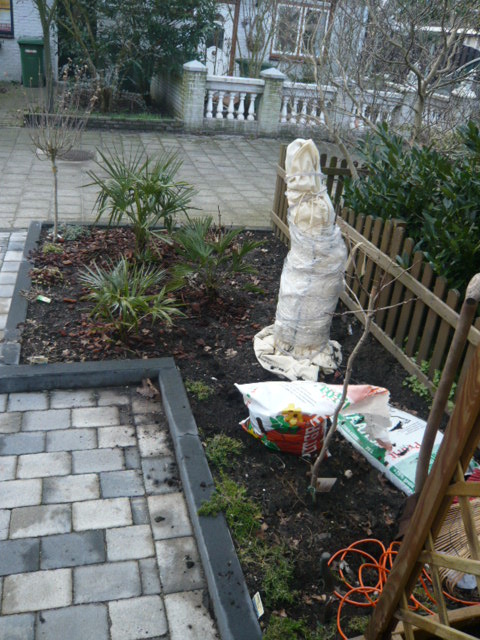 Rechts staat ingepakt een Dicksonia en links een Butia Capitata.