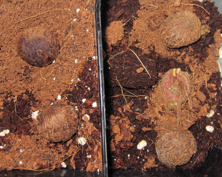 op 20 januari heb ik een aantal Jubaea-zaden (na eerst te hebben gekraakt) in een verwarmd kweekkastje geplaatst (constant 30 graden of iets hoger).