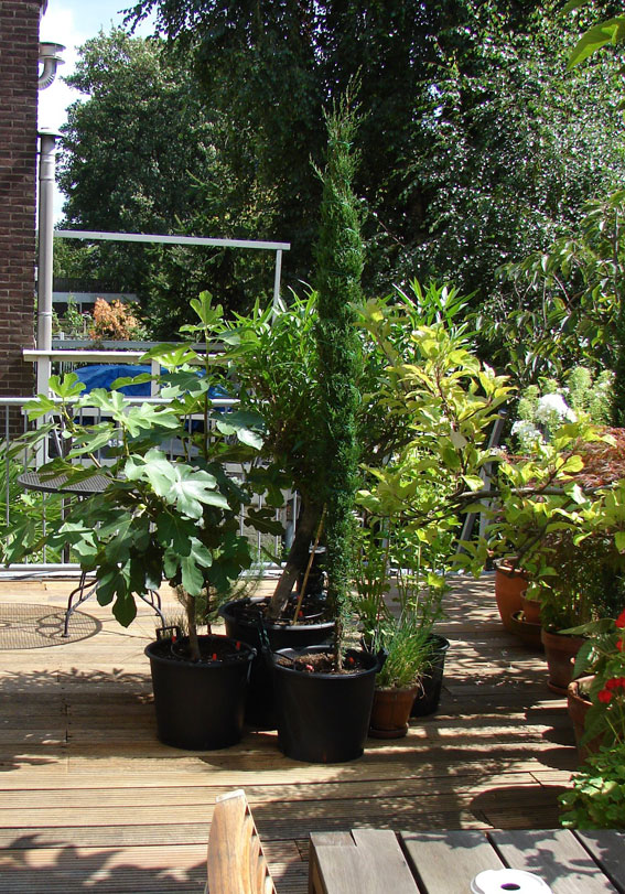 deze winter had ik er 3 nieuwe bij en had de dode bomen van het jaar ervoor vervangen. deze winter had ik wel maatregelen genomen met bescherming, ik heb 2 groepjes van 3 bij elkaar. daar heb ik palen om gezet in een driehoek, zodat als het zou gaan vriezen dat ik ze met bubbeltjesfolie zou kunnen in pakken. de bovenkant zou dan wel open zijn maar het belangrijkste is dat ze dan geen wind zouden vangen, want daar hebben ze het meeste last van heb ik gemerkt. ik heb geen bubbeltjesfolie hoeven gebruiken, maar toch zie je bij de bomen die wind vangen een bruine gloed aan de kant waar de wind vandaan komt ondanks het helemaal niet hard gevroren had deze winter.