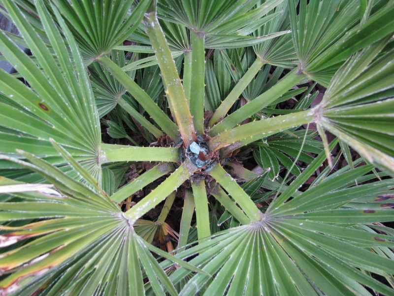 Hier heeft zelfs een Sabal Mexicana in pot de winter overleefd zonder schade terwijl mijn Sabal Louisiana in volle grond toch wat bladschade heeft.