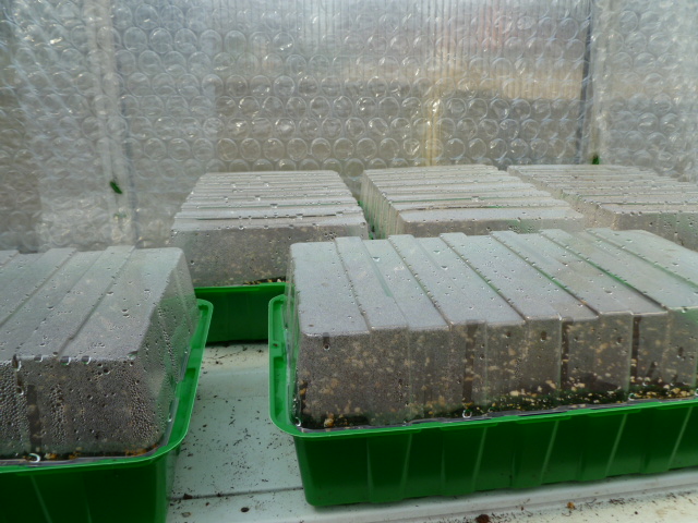 Ik ben net even gaan kijken in de serre en de bodemtemperatuur is 25-26°C. De M.sikkimensis in de twee andere bakken is ook volop aan het kiemen. Gisteren stonden er nog geen en vandaag al 4 kiemlingen