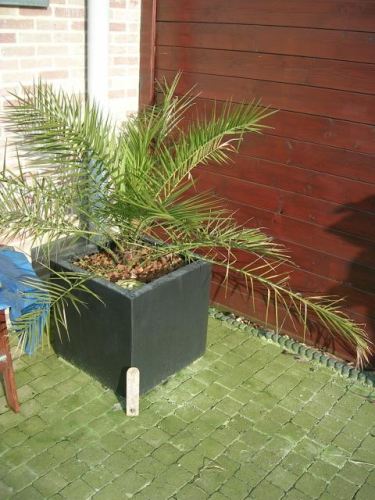 Zorgen kindje dezer dagen is deze Phoenix canariensis. Hij staat bekend om zijn slechte winterhardheid... (- 5 ongeveer). Tot nu toe heb ik deze palm al 1 winter laten overwinteren. Deze zomer is hij dan nog eens voorzien van deze prachtige zwarte pot. De potkleur was een strategische keuze. En.. hij doet het uitstekend. Zoals u kan zien staat hij op een uiterst beschutte plaats bijna volledig op het zuiden. Bovendien is hij dan nog eens voorzien van een laag van 5 cm kokosschillen (isolerend). Wat is het gevolg na een weekje nachtvorst: ' s morgens zijn de kokosschillen bevroren.. tegen de middag alles terug ontdooid bij temperaturen gemeten op deze plaats in de zon van 12 graden! Wat een zuiders plekje niet kan doen. De pot tenslotte voelt na deze uren zon zelfs lauwwarm aan. (zwart he :D ). Deze morgen heb ik zefs vastgesteld na wat voorzichtig woelen in de bovenste laag schillen dat de potgrond nog steeds onbevroren is.