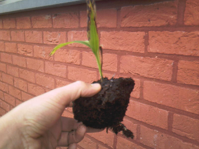 Ik heb net, met pijn in het hart, 1 van mijn 4 zaailingen uit de pot gehaald. Heb er een paar fotos van gemaakt.