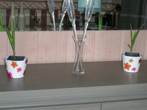 Oja de vrouw heeft uit de berging 2 zaailingen "gepikt" omdat ze die mooi vindt voor in het salon...Normaal zijn dat washingtons. Ze staan daar dus op een ereplaats in de warmte en bovendien is daar nog veel licht.
