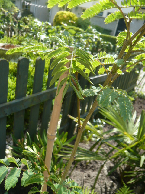 De stam was afgeknipt en grijs geverft en de vertakking zaten vol blad.