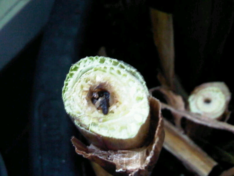 met de heliconia. Echter heb ik via v ia de tip gekregen om bij een stilstaande scheut 3/4 deel af te knippen, en zoals hij verwachte is de kern zwart. zie de onderstaande foto.