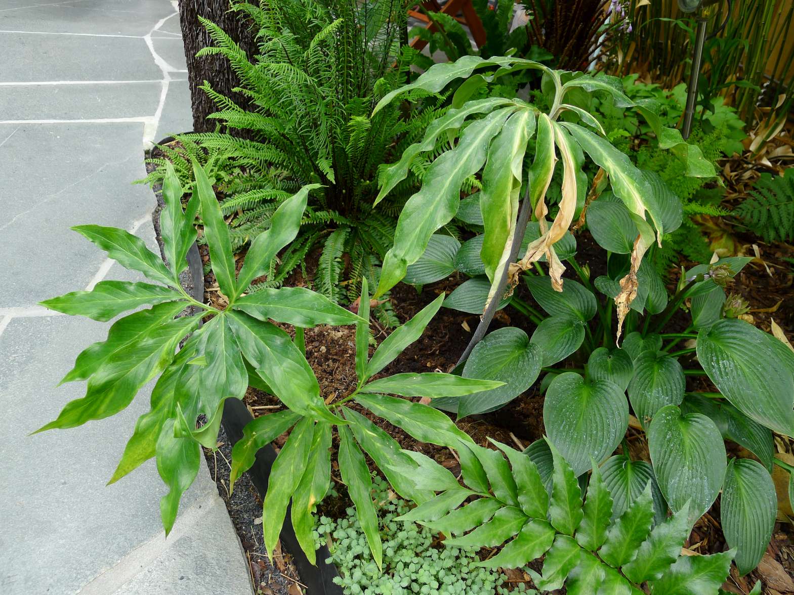 Hier stond dit voorjaar alleen maar bamboe en een paar bomen en heesters. Alle exoten, vaste planten, bodembedekkers ed. zijn dit jaar geplant.
