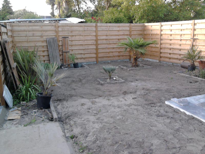 Nu nog het aanbrengen van gestabiliseerd zand rond de vijver om de houten 'vlonder' aan te leggen rondom rond (niet zelf gedaan, geen tijd ervoor). Links komen er Chamaerops humilissen en rechts een combinatie van Phormium tenax en Yucca filifera. Hier is weinig variatie in de beplanting om het strakke en open karakter aan te houden.