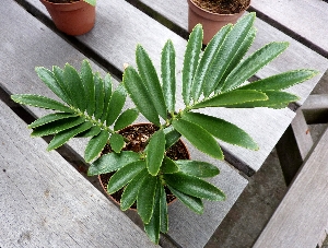 Dit is een foto uit 2006 van dezelfde Zamia furfuracea. Die komt dus uit een diep dal( een paar jaar zonder bladeren gestaan, en nu 3 nieuwe bladeren dit jaar)!