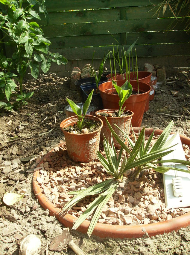 Zo nu en dan - eigenlijk heel regelmatig "google" ik wat rond om informatie te vinden over het zaaien, kweken van palmen, groeisnelheid en zo verder. Op één of ander engelstalig forum las ik dat de T. Campestris de eerste jaren vooral onder de grond groeit ( wortelvorming dus ) En toen begon ik te denken, wat als de wortels niet verder kunnen groeien of misschien groeien er wel een paar door de bodemgaten door ... enkele weken terug was ik te nieuwsgierig en heb de plant met pot en al terug uitgegraven gewoon om eens te kijken (tja een beetje overdreven zeker). Wat ik toen zag overtrof wel alle verwachtingen, verschillende wortels hadden hun weg gezocht door de bodemgaten van d e pot, verschillende waren zelfs al 40 cm in de grond gegroeid (ik lieg niet). Dus gezien het hierboven gesimuleerde microklimaat waren sommige wortels 60 cm gegroeid in nog geen 5 maanden tijd ! Ook mijn vrouw was hiervan onder de indruk. (en zij heeft slecht matig interesse in die planten)