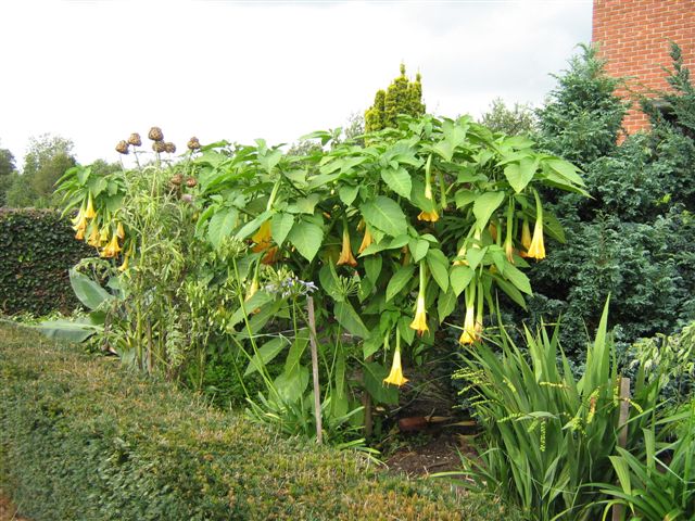 Mooie exoten ! Een gele Brugmansia is altijd een pracht om te zien, dan hebben we nog niet over de paradijselijke geur 's avonds. Zo'n gele B. bloeit massaal, maar het enige 'jammere' is dat de plant er lang bloemenloos bij staat, en als het dan zover is, en de plant is uitgebloeid, dan moet je wachten op een volgende golf, als het niet te ver op het najaar is. De roze B bloeit dan wel door, maar vaak niet zo massaal. De bloemen hangen ook niet naar beneden. Maar toch ook een geweldige verschijning als je ze goed verzorgt, ze geuren anders, maar evengoed paradijselijk. Momenteel heb ik een witte dwergvorm, die ook massaal bloeit met witte trompetjes recht naar beneden met overweldigende geur 's avonds. Ik heb er ook lang moeten op wachten, maar de bloemen zijn nu voor het hele najaar.