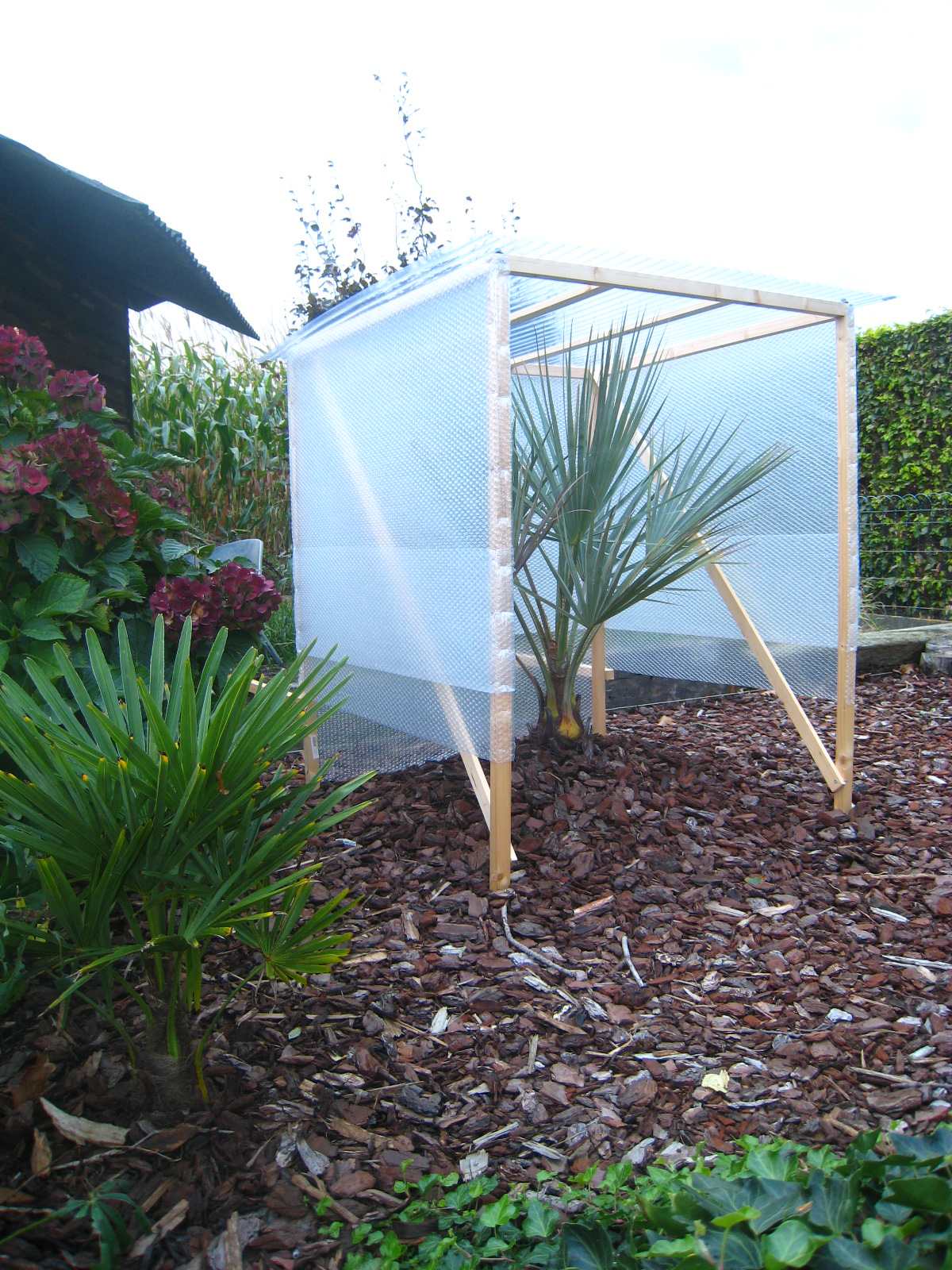 vandaag mooi weer en dacht , ik ga de butia en brahea (1ste jaar in de grond) beschermen, palen stonden al, nu noppenfolie errond gedaan, lichtslang rond de stam en plastic fles over de speer en bladeren samengebonden. Zodra het echt gaat vriezen a volonte dan komt het dak erop en gaan de lichtslangen aan.