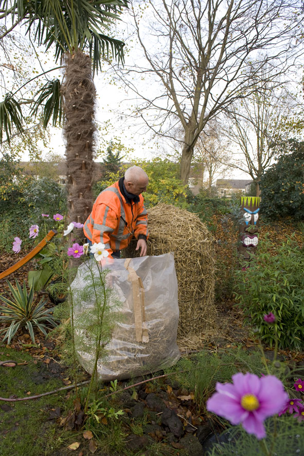 Van het weekend serieus bezig geweest met winterbescherming. 2 dicksonia antartica's zijn zo goed als ingepakt, het deksel van de isolatieplaten zit er nog niet op, want het is heerlijk weer voor de varens! De musa basjoo is nu wel helemaal ingepakt. Ons bananenbos is eerst in jute gewikkeld, daarna heeft hij een frame van gaas gekregen, daaromheen weer een laag jute, daar weer omheen een flinke laag stro, de binnenkant van het bananenbos blijft dus vrij. Als laatste laat is wederom jute gewikkeld en de bovenkant is voorzien van een laag plastic tegen de regen en sneeuw. Mocht het heel koud worden, dan kan bij de boomvarens een klein kacheltje bijgezet worden of lichtslang, dat zien we wel weer als het kouder wordt...Bij de musa kan ook altijd nog een lichtslang aangebracht worden.