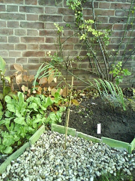 Ook dit voorjaar (rond mei) geplant: Olea europaea, volgens de verkoper uit Portugal (Algarve) geïmporteerd. Hij staat maar 40 cm van de muur af. Hij heeft al veel weertypen doorstaan: droogte, natte zomer en nachtvorst tot -4 graden. Toen ik hem kocht had hij al kleine olijfjes aan enkele takken. Rechts kun je een kleine Cypressus macrocarpa 'Goldcrest Wilma' zien. Deze schijnt de meest winterharde Monterey cypres te zijn. Heb elders in Nijmegen al één van anderhalve meter gezien in de volle grond.