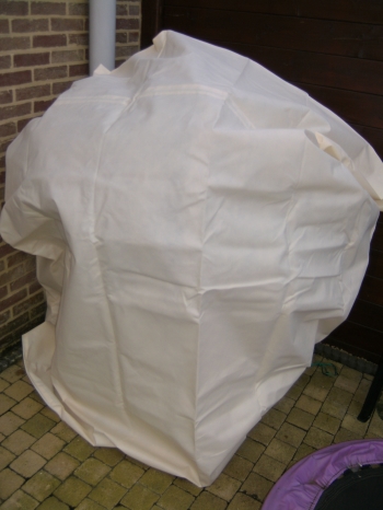 Bij thuiskomst heb ik het frame eerst op antiworteldoek geplaatst. Vervolgens de tentharingen op verschillende plaatsen door het frame en het doek in de bodem.