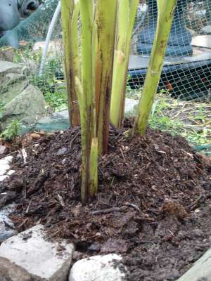Jaak, ik zie dat je bovenop de verpakking van de stammen het oude blad afval van de plant hebt gelegd, dit kan je er beter uit halen omdat dit als eerste gaat rotten en daardoor de stammen daaronder ook kunnen gaan rotten. Ik weet ook niet of het compost wat je onder bij de stammen hebt gegooid droog was anders gaan de stammen daar ook rotten.