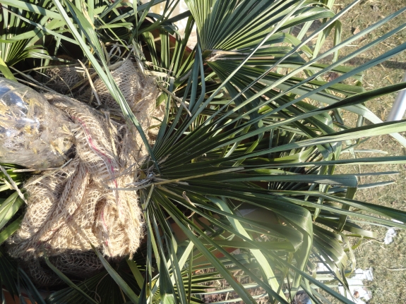 De potten met Chamaerops humilis die ik in de blokhut heb staan zijn nog vervroren.
