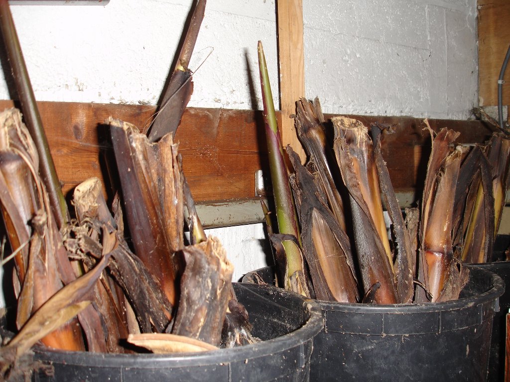 de bananen moet ik nu voor de 3e keer een stuk inkorten,die blijven maar groeien,ze zijn enkel stil gevallen tijdens de 2 weken strenge vorst toen was het in de garage 6 graden