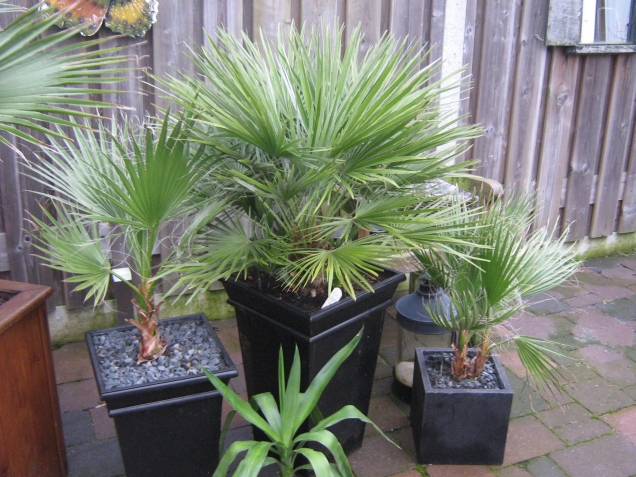 Voor de vorstperiode hebben de palmen onder een afdak gestaan, waar ze goed droog bleven.