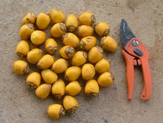 Rechts heb ik hetzelfde exemplaar gepeld NA 36 uur geweekt te hebben, het is te zeggen de harige vezels verwijderd. (de (cocosachtige) vezels waren bij het pellen redelijk vettig).