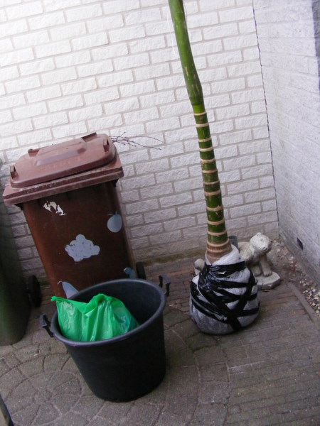Ik heb de palm opgepot in 65 L kuip in speciale palmgrond van GardenPalms, Palm potting Compost.