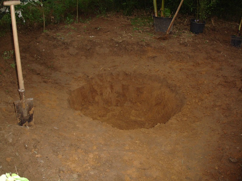 In dat lager gelegen punt , waar de Gunnera ging komen heb ik een put gemaakt van 1m diep en 1,5m diameter, en deze is volledig gevuld met koemest.
