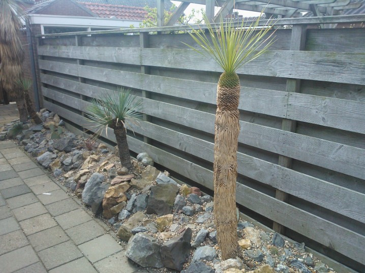 De grotere rostrata's aan het eind van de strook staan in de volle grond, de kleinere yucca's ertussen allemaal in zeer ruime potten. Dit met oog op eventueel verplaatsen, aanpassen strook icm de zeer tere wortels. De cactussen staan allemaal ook gewoon los in de "volle grond" aangezien die grotendeels op de plek staan en makkelijk wortelen.