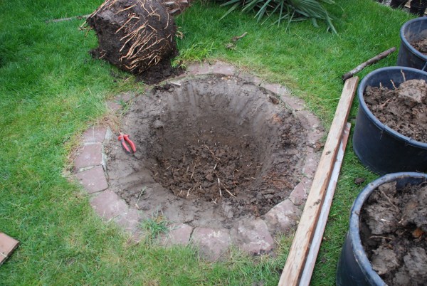 Plantgat waar al redelijk veel wortels aanwezig waren van de vorige bewoner (Trachycarpus) :)