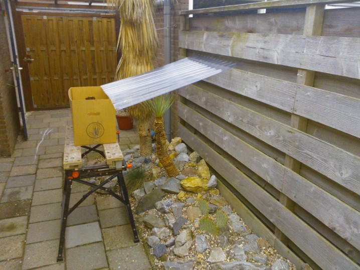 ik ben vandaag toevallig bezig geweest met de "winterbescherming" d.w.z. golfplaten gezaagd. ik maak er alleen een afdak boven, de regen komt van achter dus tegen de schutting bij de buurman. golfplaatjes van 1.07m en dan 12 naast elkaar. maak een framepje van balkjes met panlatten en dan stukken van 1.80m waar twee stukjes golfplaat op zitten dus afdak in delen van 1.80m bij 1.07m. steek ze achter in de schutting met een panlat voor en achter dat ze op de plek blijven en voor een paaltje eronder. achter met een schroefje aan de schutting en voor de paaltjes met een plug in de trotoirband :mrgreen: