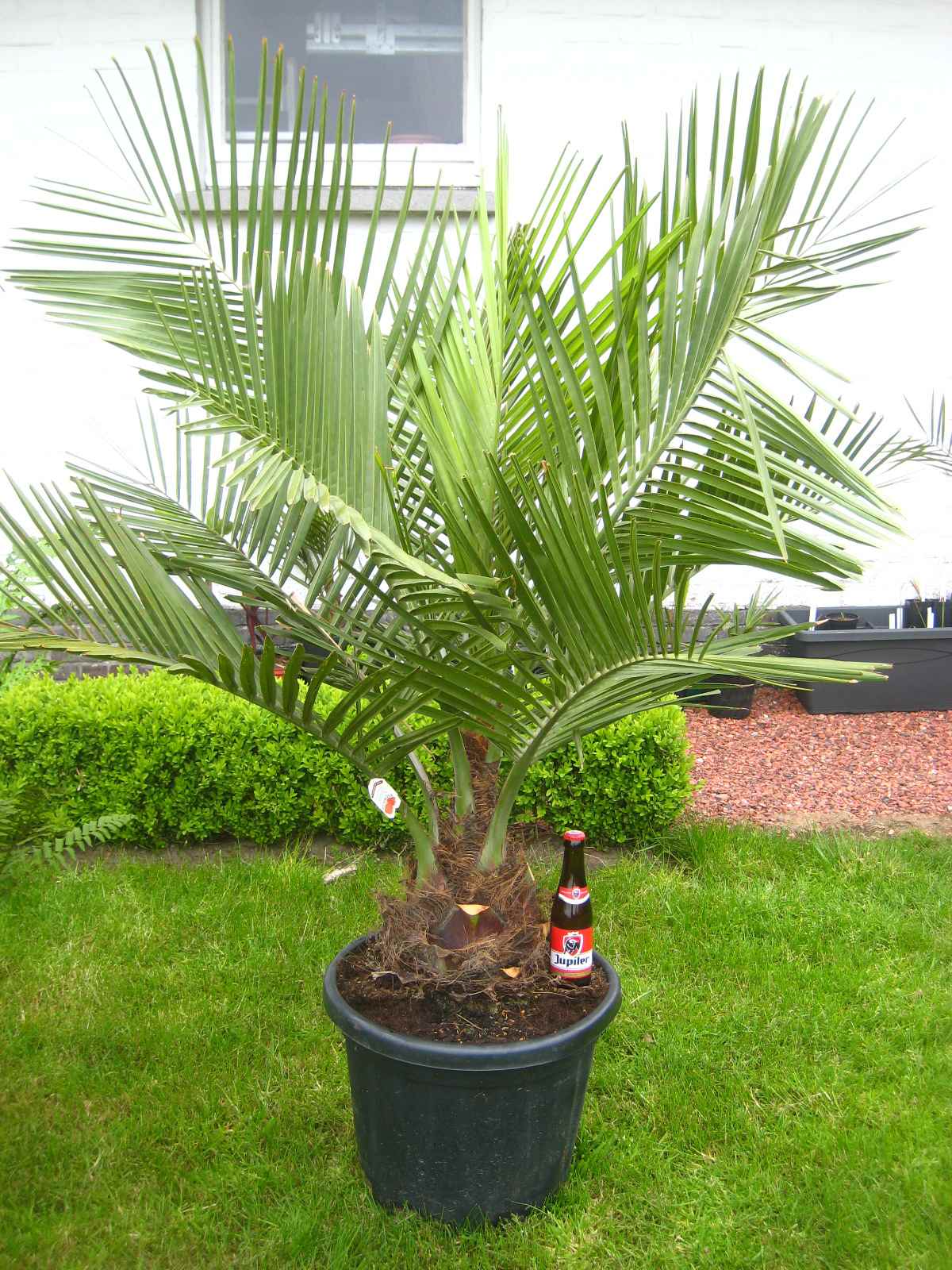 Mijn aanvankelijke testJubaea, aangeplant in de zomer van 2009 bleek de winter van 2009/2010 en 2010/2011 prima te hebben doorstaan. Ik beschermde de plant met een afdak, blad op de wortelkluit en wat jute rondom de poten van het afdak om de wind er een beetje vanaf te houden/te breken. -11 was in die winters het minimum en ik weet het niet meer precies maar een van de winters had 23 ijsdagen.
