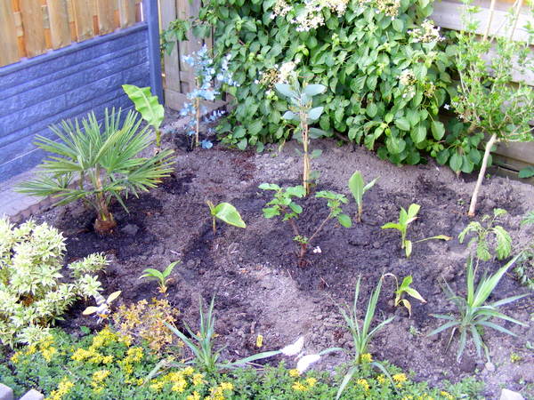 Vandaag weer verder gegaan, en de middelste bak in de tuin weer netjes gemaakt. 2 Stuks jeneverbessen er uit gehaald, wat canna's toegevoegt en een alocasia macrorrhizos. De grote archontophoenix alexandrae staat nu ook buiten omdat de temperaturen tot het weekend goed zijn. A.s zaterdag verwachten ze een temperatuur van 3 graden in de nacht :?