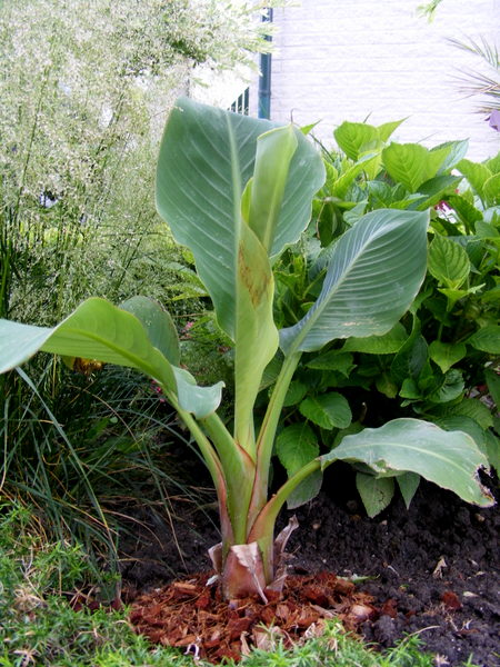 Helaas veel lelijke bladeren bij de bananen en canna's door combi wind/regen.