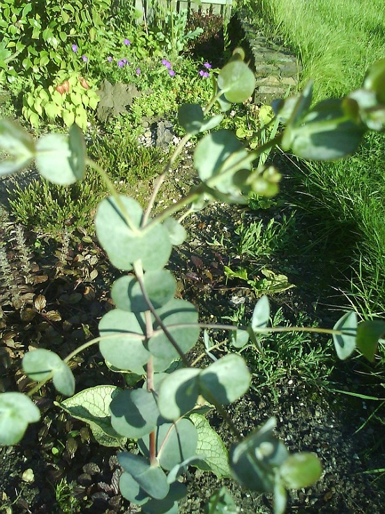 Alles boven de bamboestok zijn nieuwe scheuten van deze eucalyptus debeuzevillei. Alle nieuwe scheuten daaronder heb ik zorgvuldig weggeknipt om hoogtegroei te stimuleren.