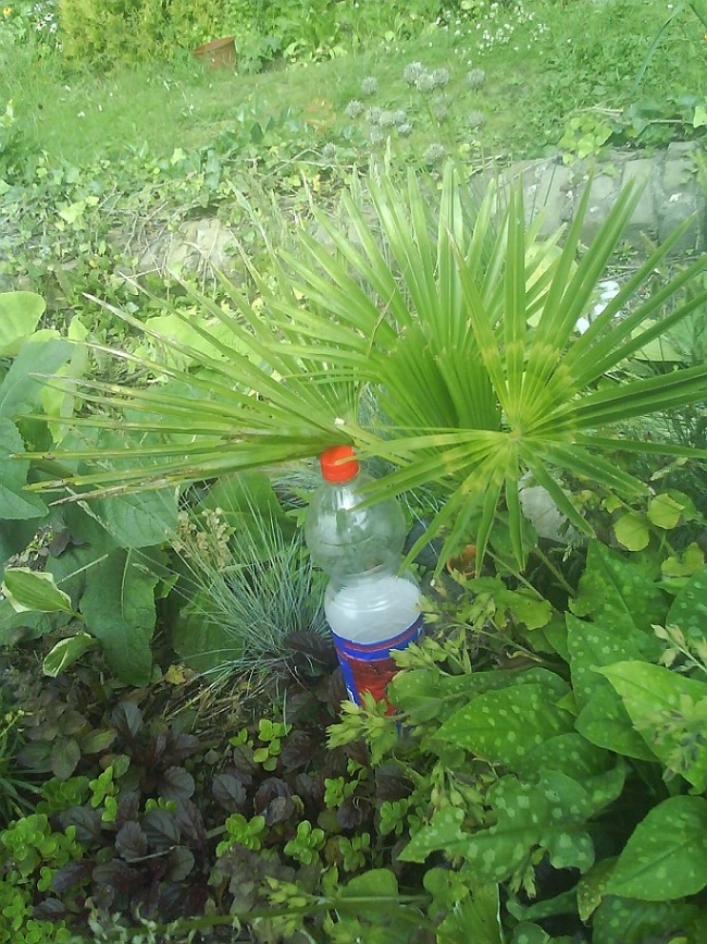 Nadat het tweede volwassen blad aan de Trachycarpus sp. nova heb ik het jeugdblad verwijderd. Nu de hoogte in!