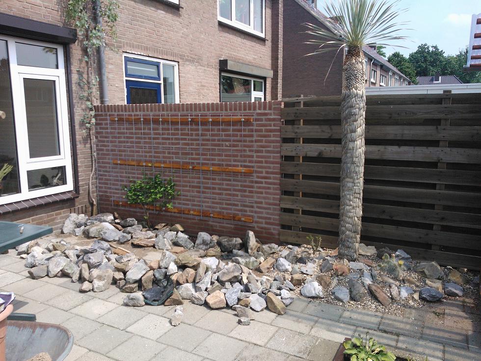 stukje onder de tegels weggegraven, worteldoek eronder en de eerste laag stenen onderin dichtgevoegd met zand. komen wat klimplantjes tegen de muur en de strook zelf wordt opgebouwd met stenen en grind ertussen. nu nog wat plantjes weer verzamelen :D