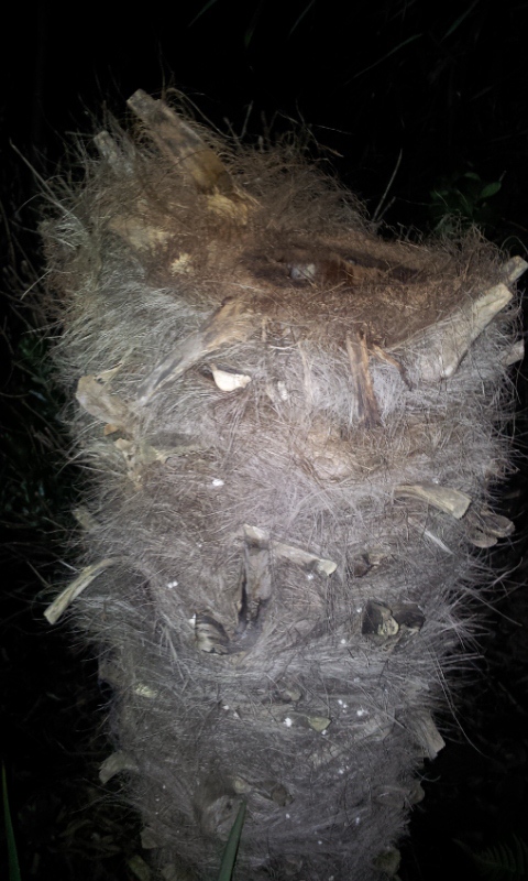 Bij sommige palmen liet alleen de speer los en bleven de (gevriesdroogde) bladstelen stevig zitten. Wat overbleef was een (vrij klein) gat. Ik heb de diepte van het gat gemeten en daar de zaag in gezet. Het resultaat was dat de kern al na een paar dagen omhoog geduwd werd. :)