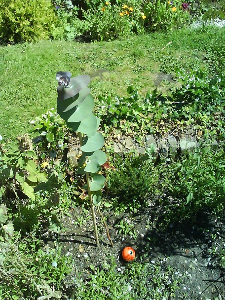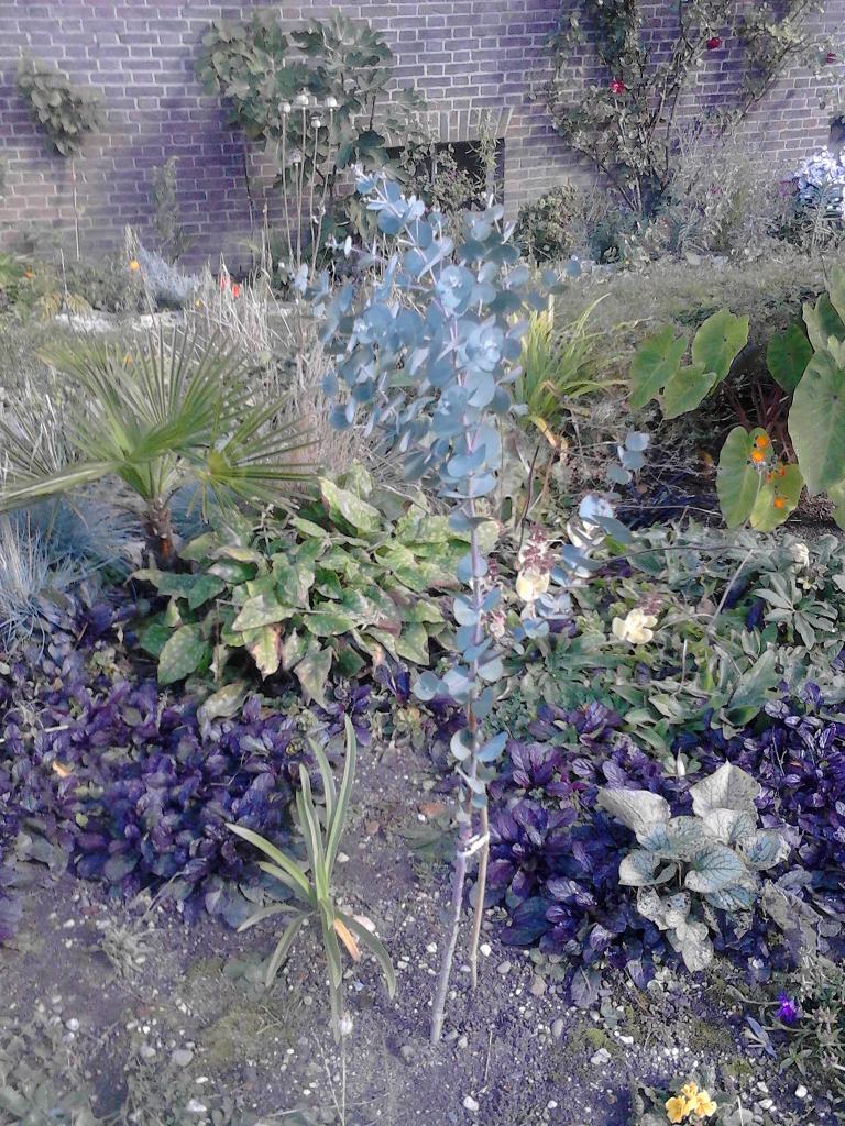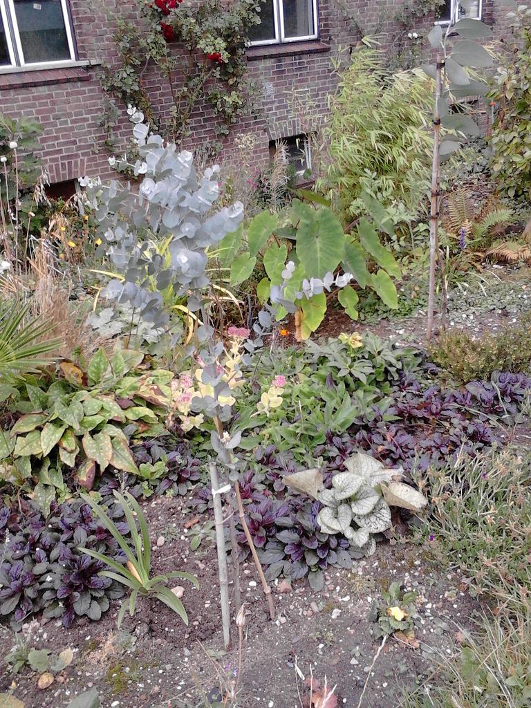 Eucalyptus debeuzevillei en Colocasia 'Pink China', sinds december 2011 in volle grond, euc. 80 cm gegroeid.