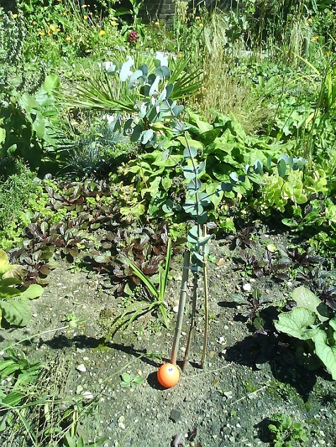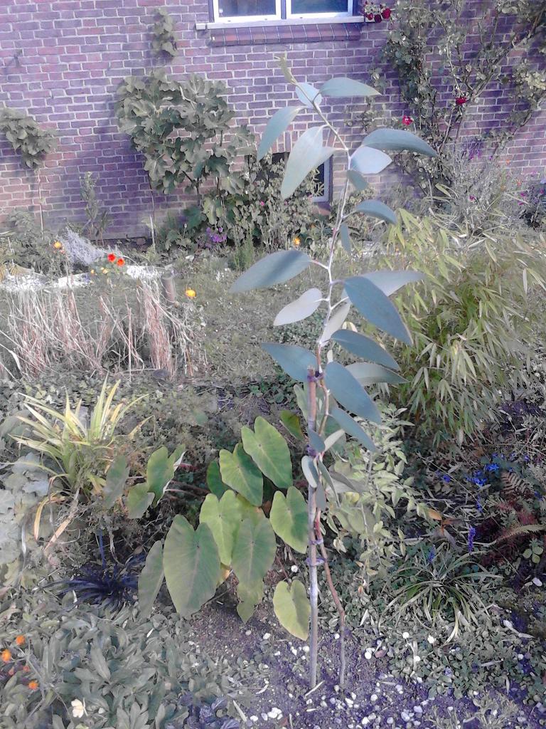 Eucalyptus debeuzevillei en Colocasia 'Pink China', sinds december 2011 in volle grond, euc. 80 cm gegroeid.