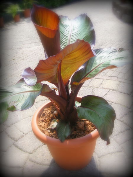 Links in beeld een groepje basjoo die met ruim 1 mtr stam op zolder heeft overwinterd en pas laat in het voorjaar de volle grond is ingegaan. Daarvoor zoveel als mogelijk was, in de volle zon en vaak aan moeten knippen